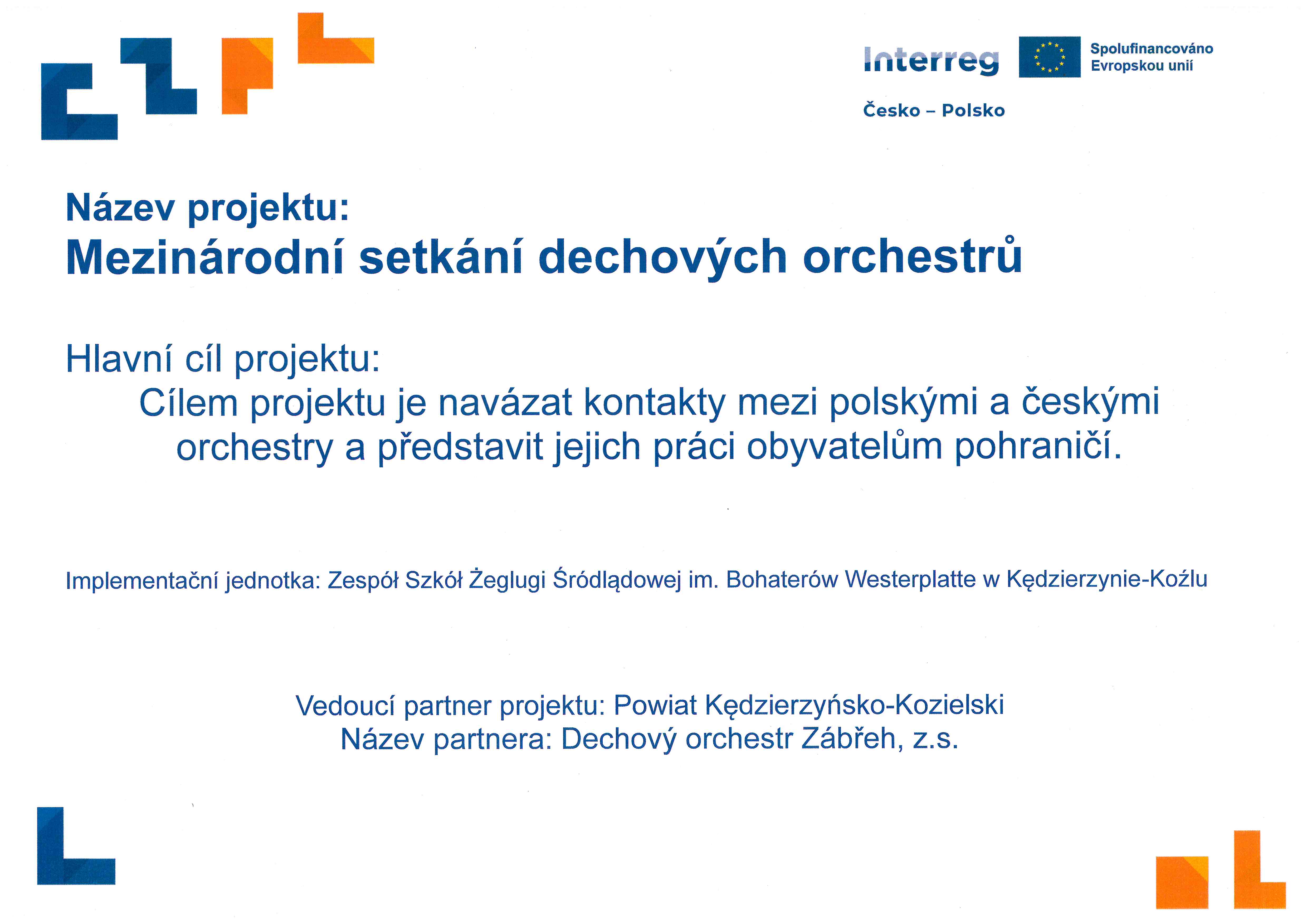 Okres Kędzierzyn-Koźle a Školní komplex vnitrozemské plavby Bohaterů Westerplatte v Kędzierzynie-Koźlu společně s českým partnerem, kterým je Dechový orchestr Zábřeh, z.s., realizují projekt s názvem „Mezinárodní setkání dechových orchestrů” / „Mezinárodní setkání dechových orchestrů” v rámci Fondu malých projektů Euroregionu Praděd – Programu Interreg Česko-Polsko 2021-2027, Priorita 4, specifický cíl 4.2 Prohlubování přeshraničních vazeb obyvatel a institucí česko-polského pohraničí.